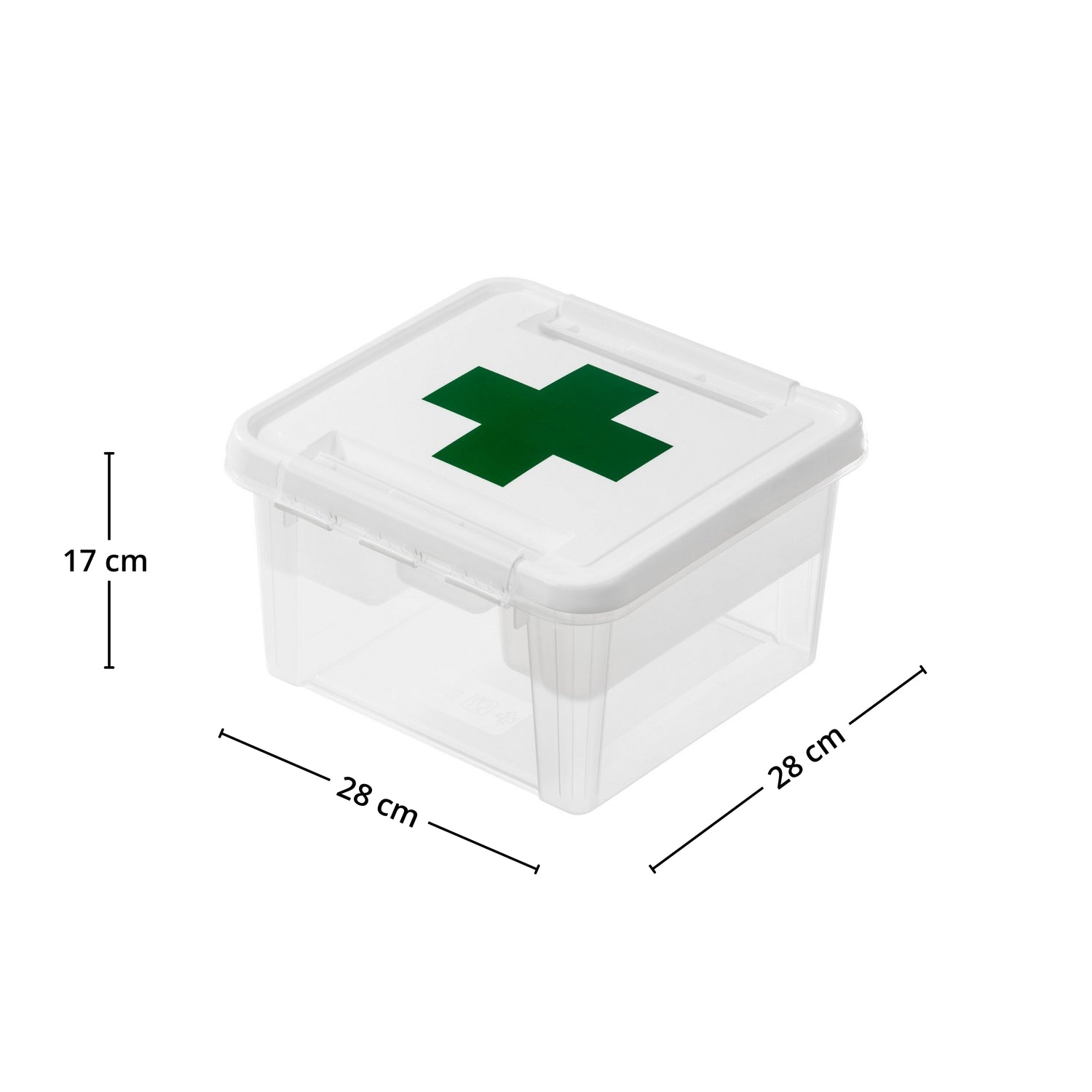 Du får en 7 liters oppbevaringsboks med tydelig førstehjelpssymbol, lokk og praktisk innsats som sorterer småting. Innsatsen gjør at det som brukes ofte ligger øverst, mens resten ligger trygt under.