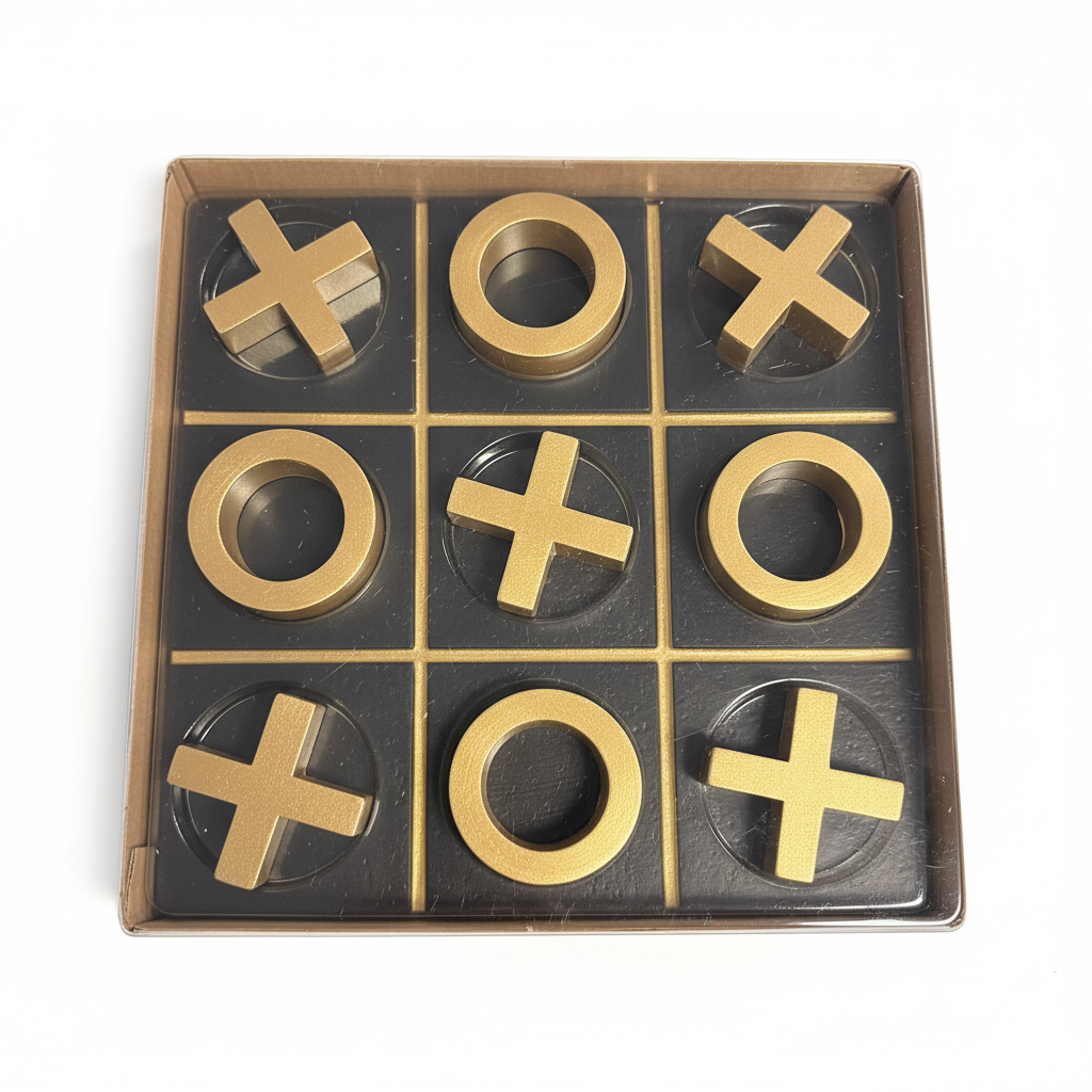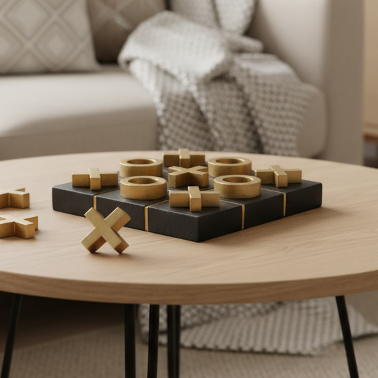 Gi stuebordet et lekent og moderne uttrykk med dette 3 på rad-spillet i sort og gull. Spillet kombinerer klassisk underholdning med et rent design som gjør det like fint som pynt som til bruk.