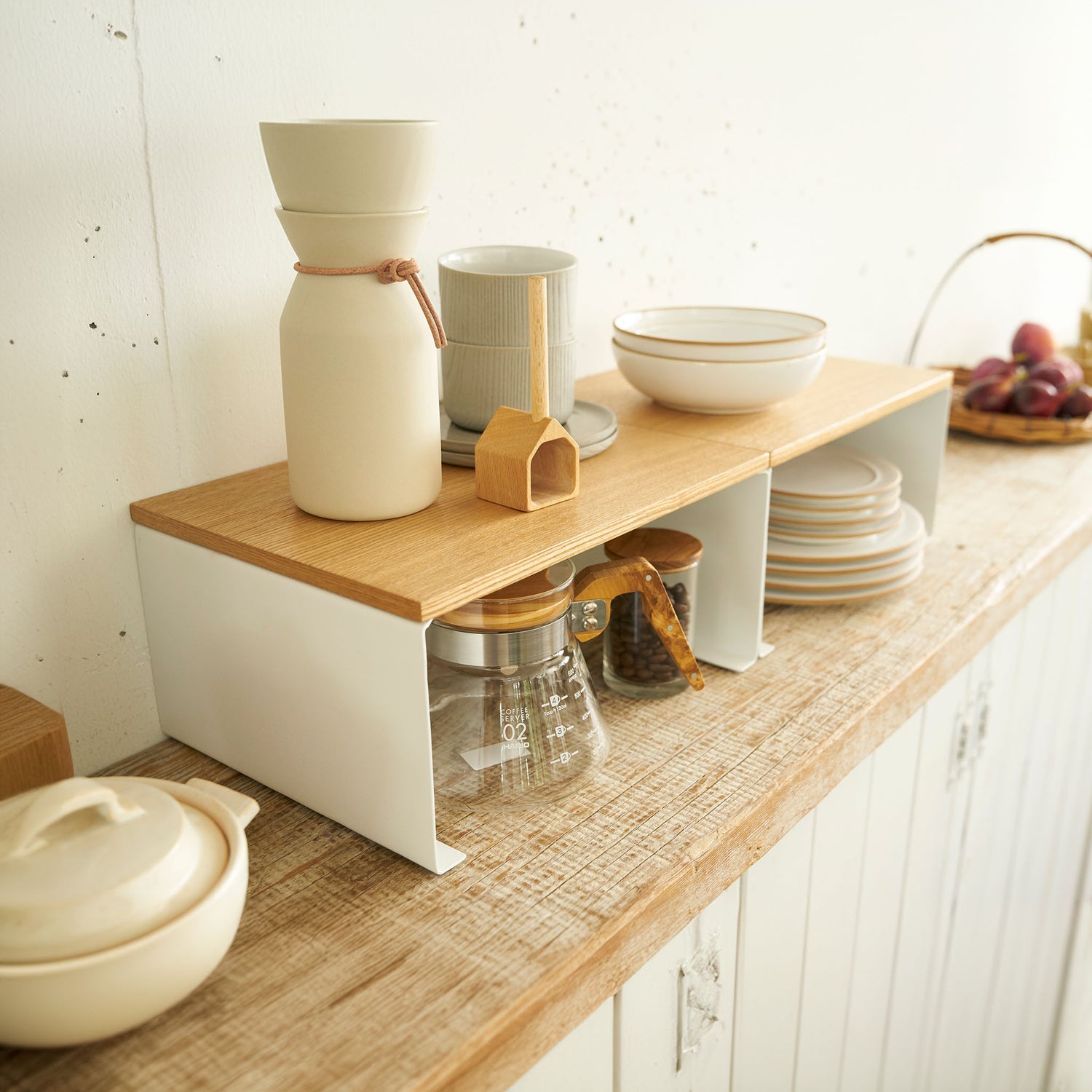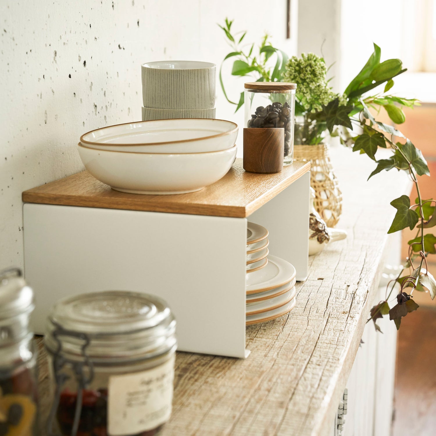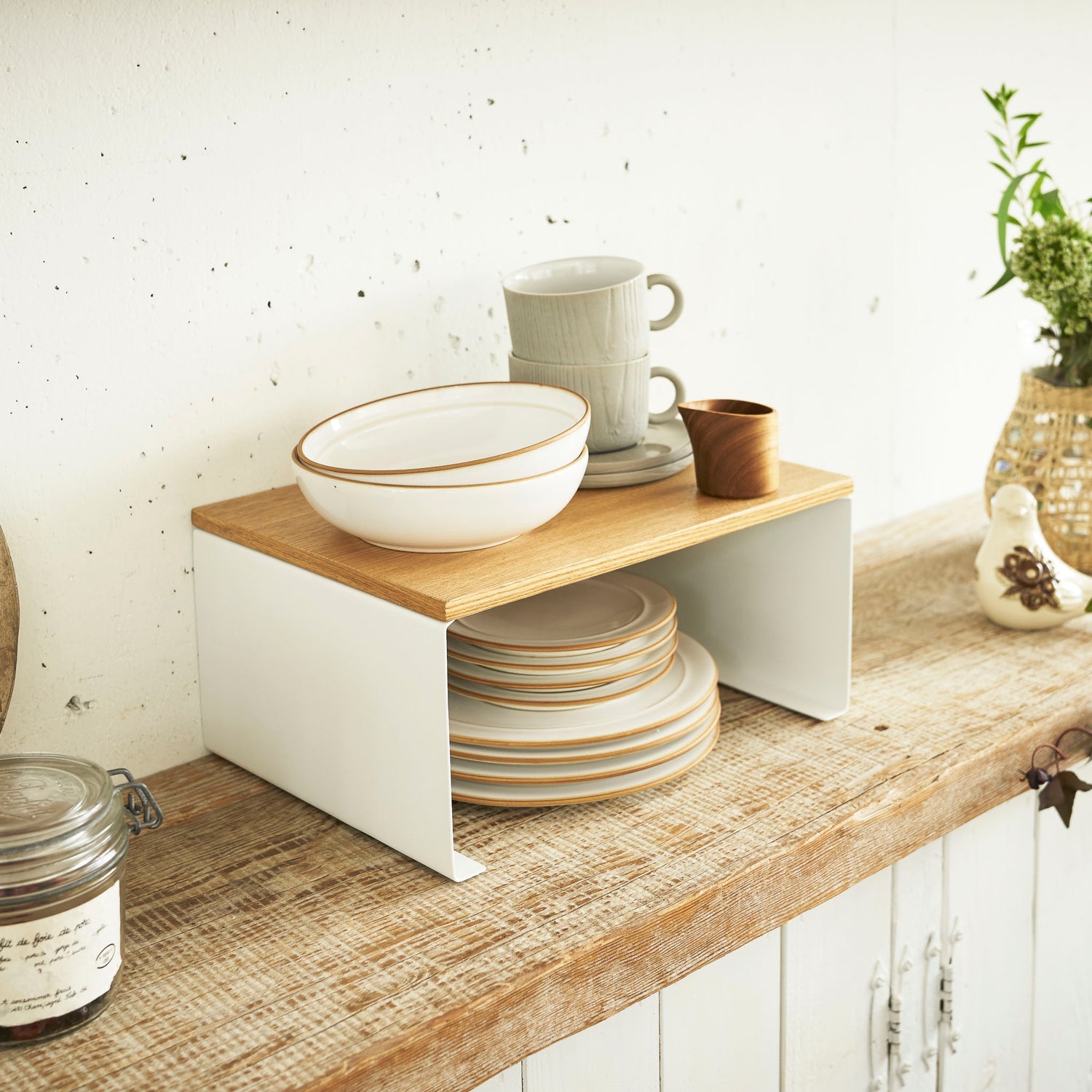 Denne kjøkkenhyllen hjelper deg å utnytte plassen bedre i skap og på benk. Den stabelbare konstruksjonen gir fleksibel oppbevaring, slik at du enkelt kan bygge høyde og få oversikt over skåler, kopper og krydder.