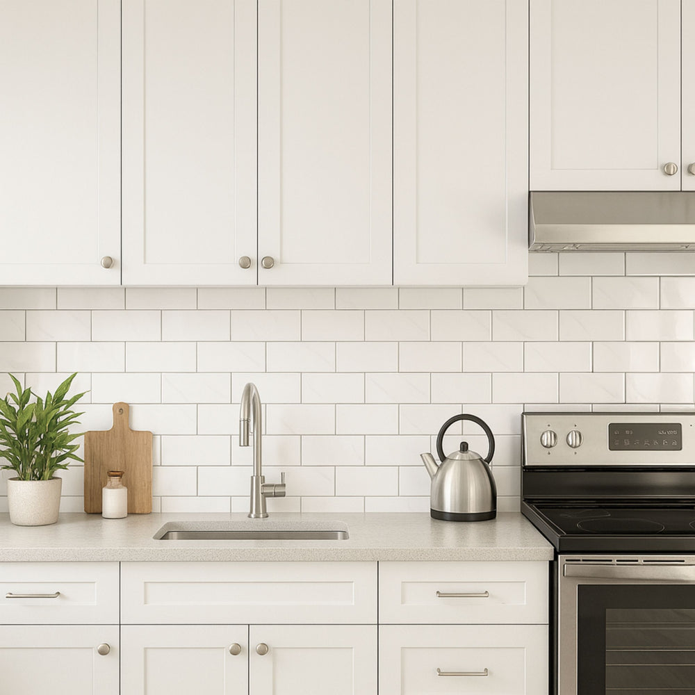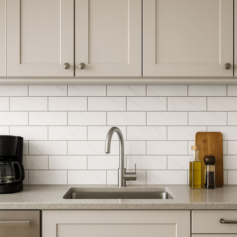Stein Subway marmor selvklebende veggfliser imiterer klassisk hvit marmor med delikate grå marmoreringer og har ferdig grå fuger for et naturlig uttrykk. De selvklebende arkene monteres enkelt uten lim eller fugemasse, perfekt for rask oppgradering av kjøkken, bad eller vaskerom.