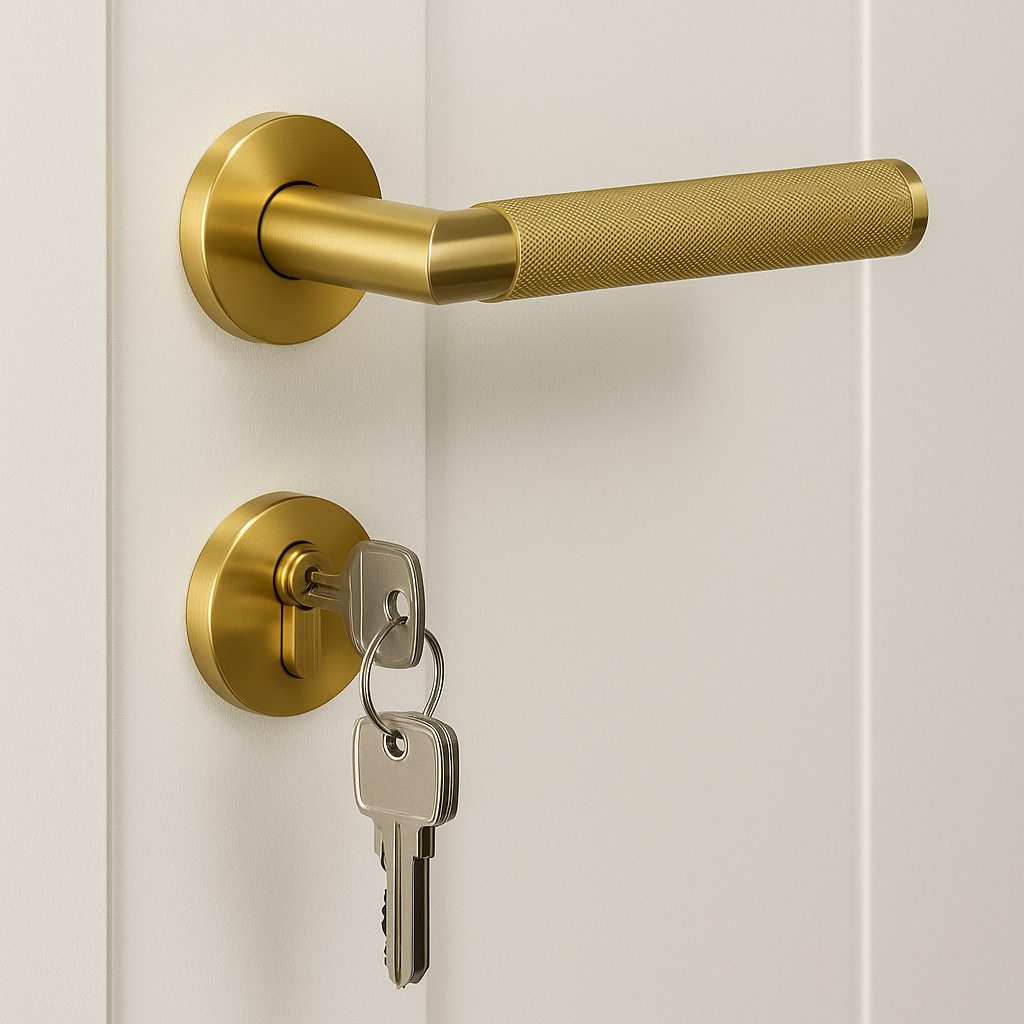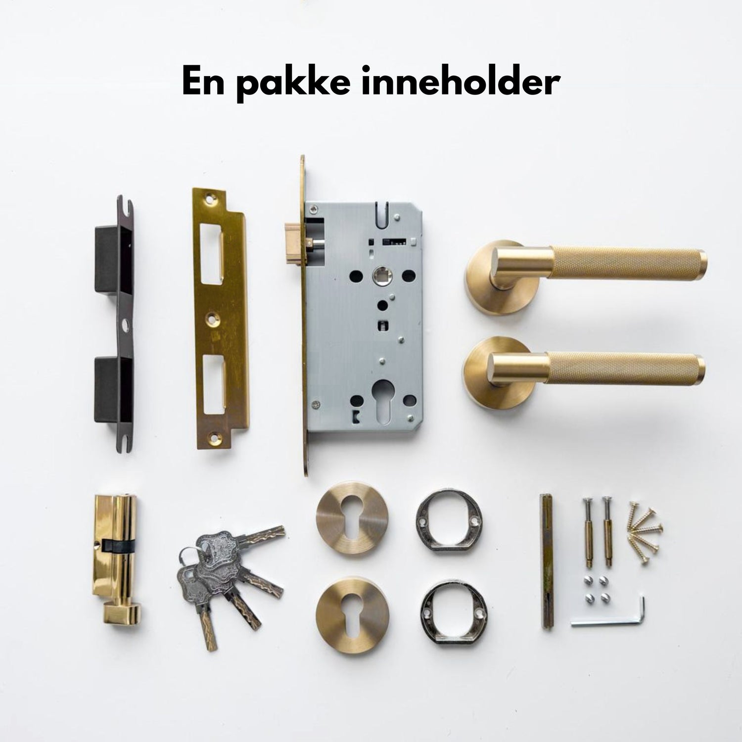 - Pakken inneholder: dørhåndtak, nøkkelringer, låskasse, låsesylinder, nøkler, skruer