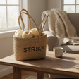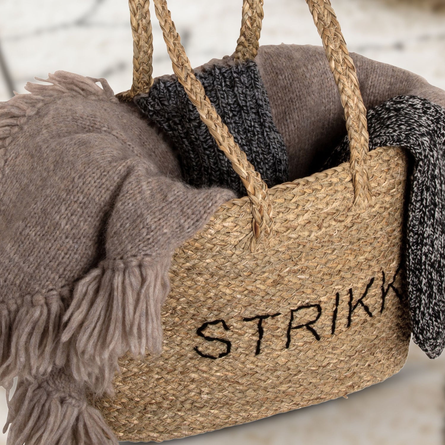 Oppbevaringskurv til strikketøy. Vesken rommer 54 liter og har en lang hempe som gjør det enkelt å frakte med seg strikketøyet mellom hjem og hytte eller ut på møter.