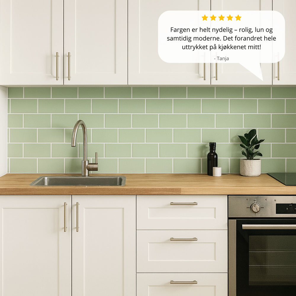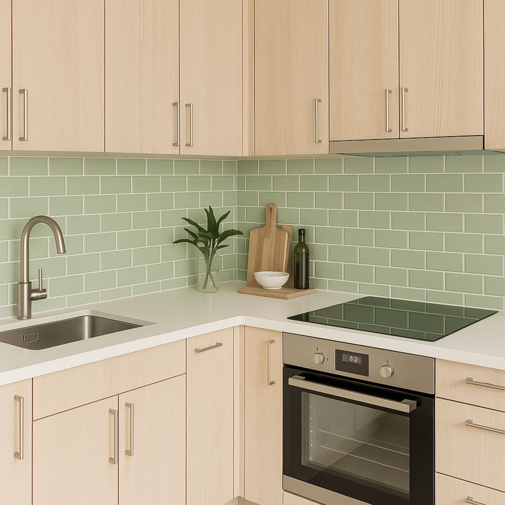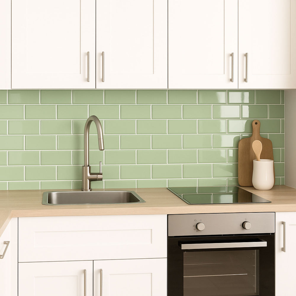 Lyst kjøkken med Subway Sage Green selvklebende veggfliser som gir frisk og moderne stil.