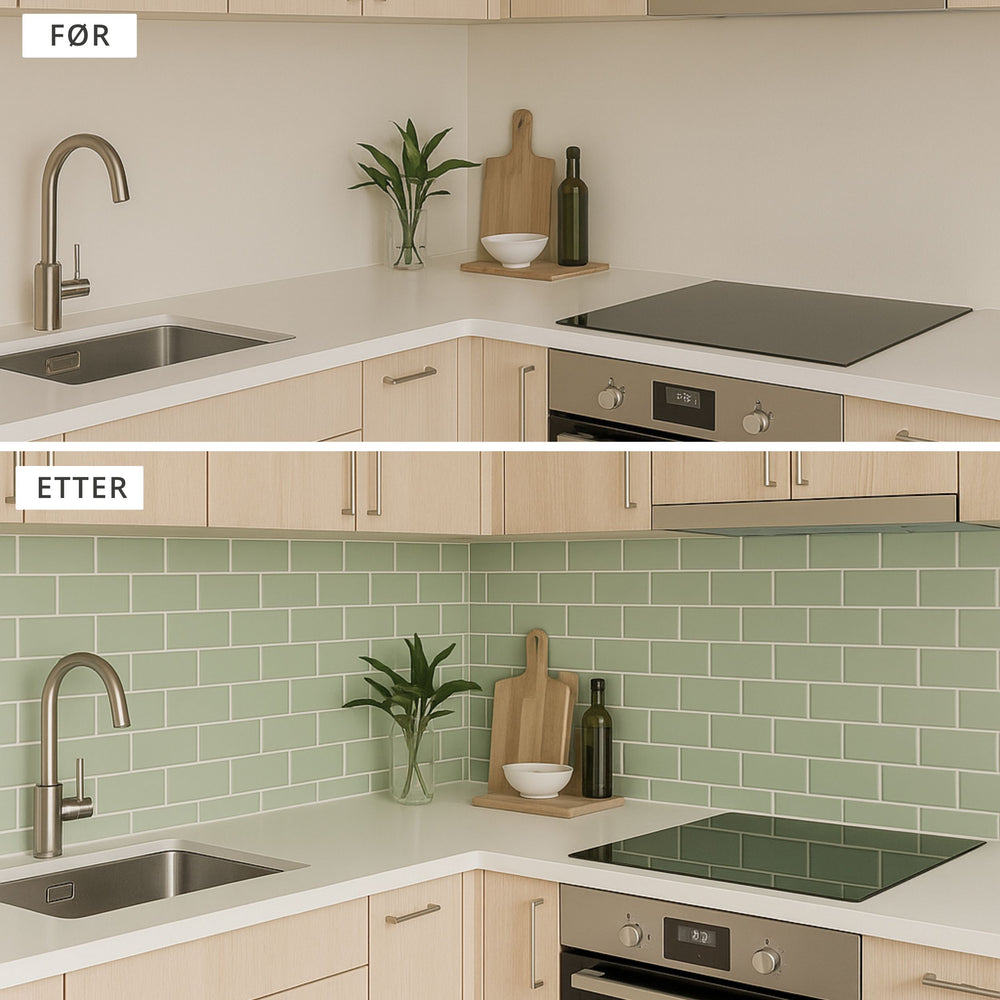 Gi kjøkkenet eller badet en moderne oppgradering med Subway selvklebende fliser i sage green. Disse flisene etterligner klassiske subway-fliser og kommer i en lys grønn nyanse med hvite fuger som skaper et friskt uttrykk. Den glansede finishen gir rommet en luksuriøs følelse. Perfekt for deg som ønsker en rask, rimelig og enkel oppussing uten håndverker.