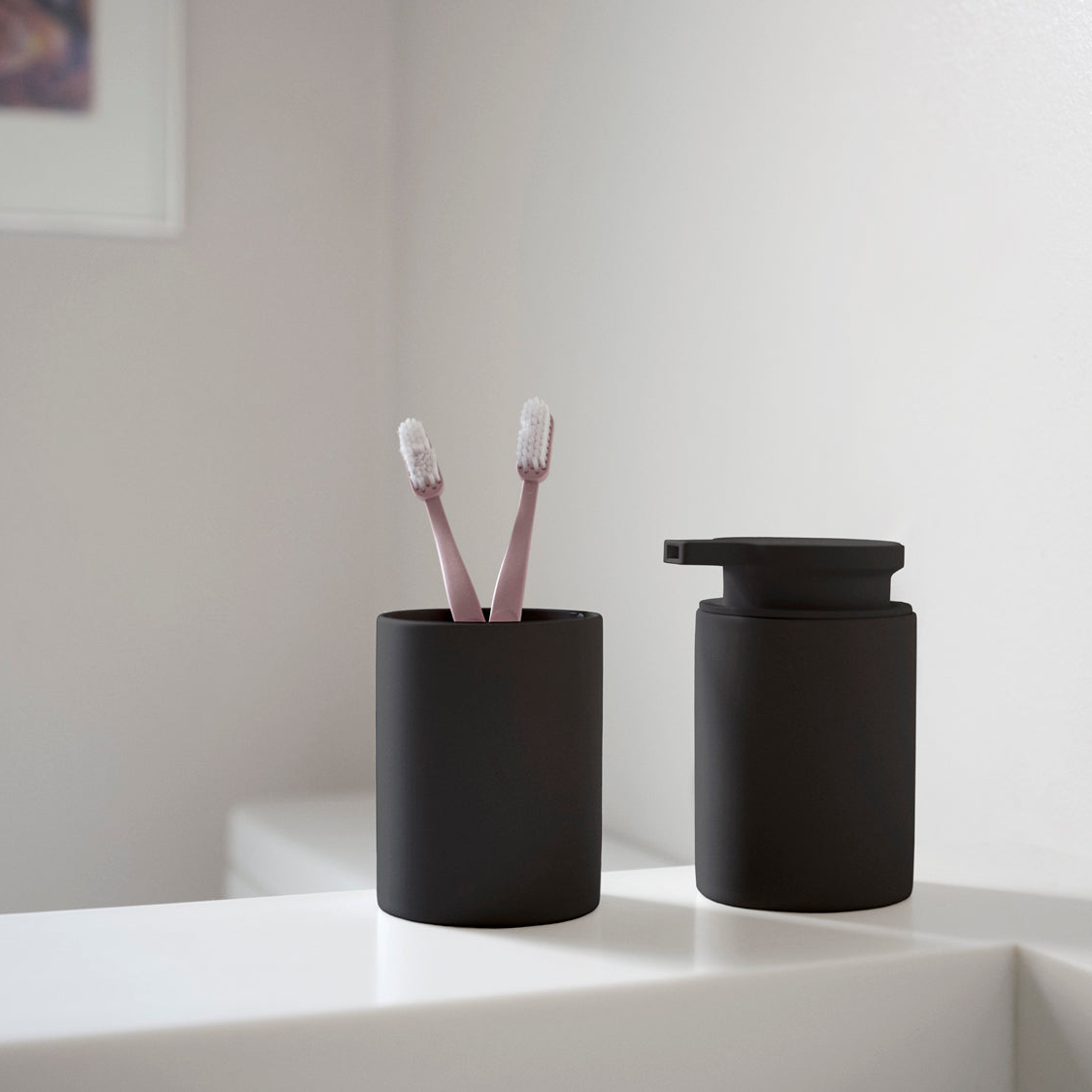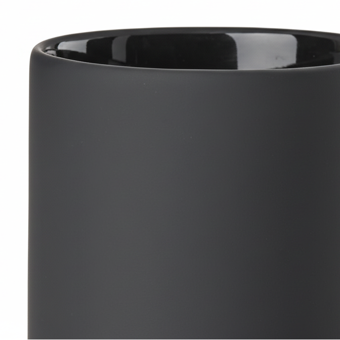 Den er laget i solid steintøy med en matt sort overflate som gir tyngde, stabilitet og en eksklusiv følelse i hånden. Med diameter 7,6 cm og høyde 10 cm rommer den flere tannbørster uten å oppta unødvendig plass.