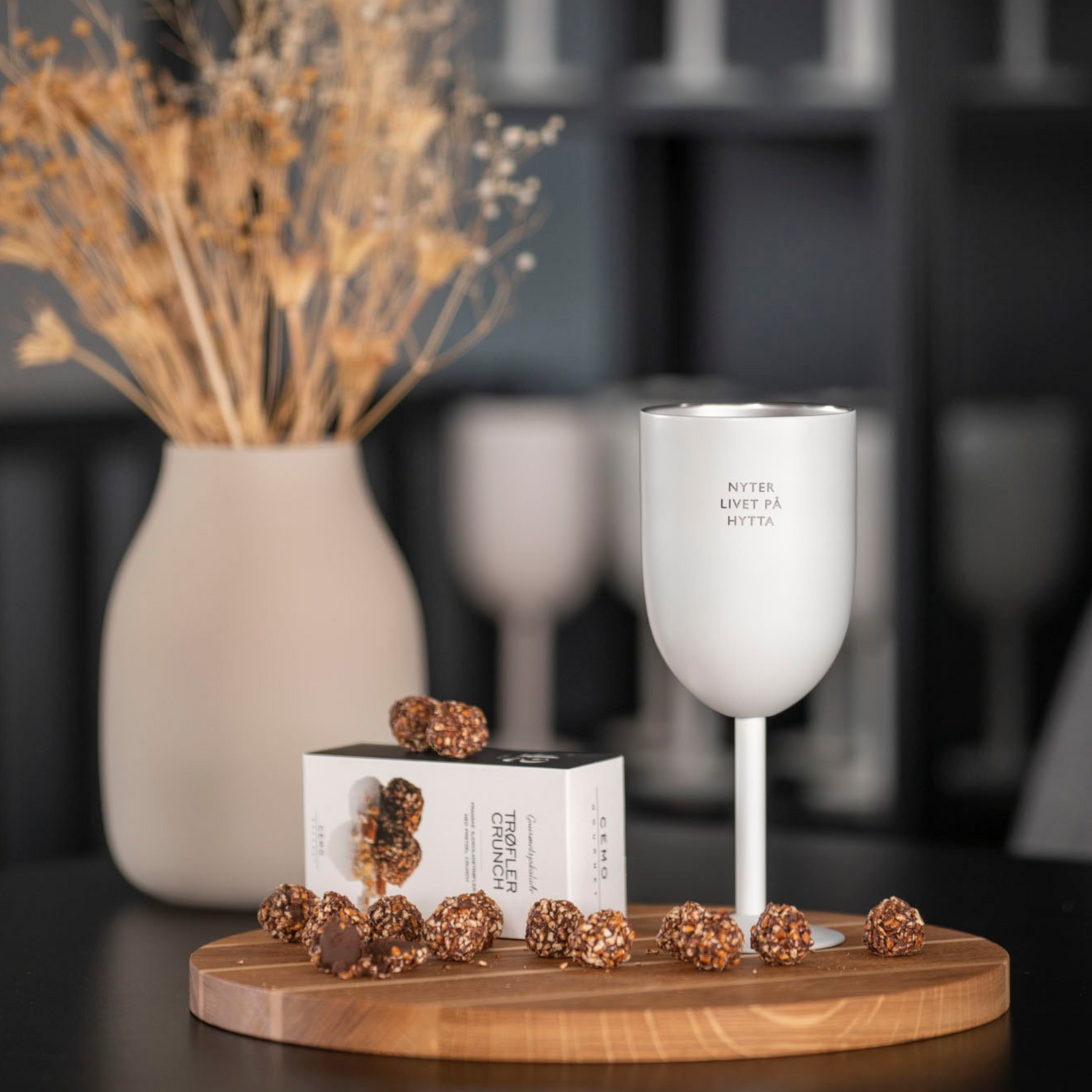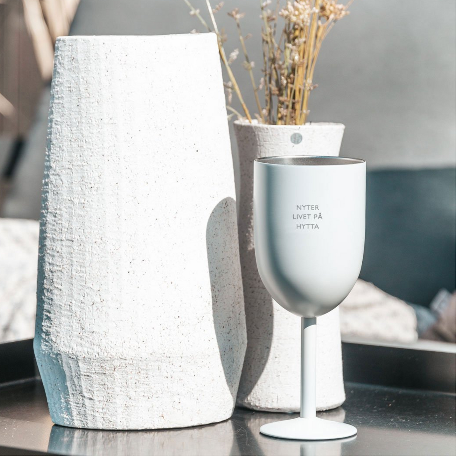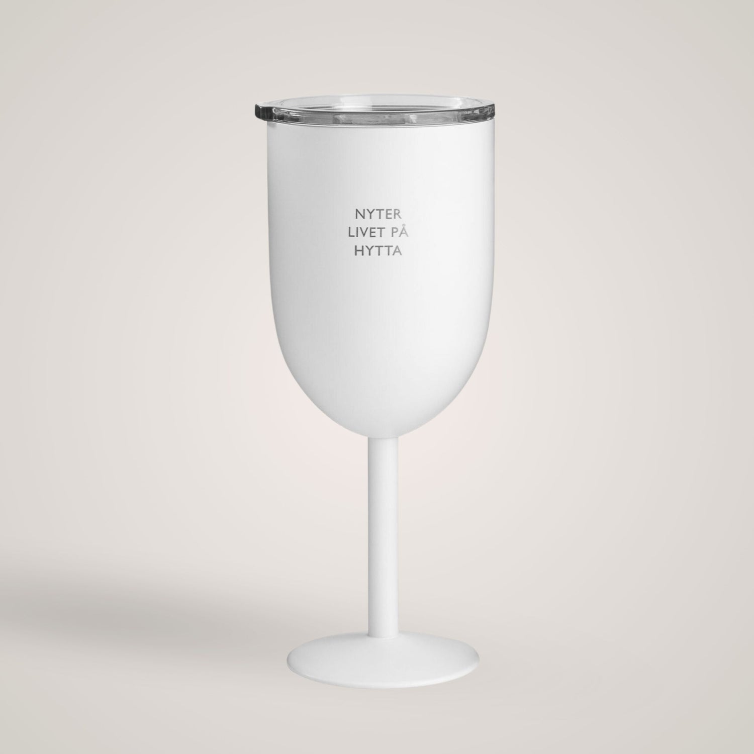 Termo-vinglass holder drikken kald. I tillegg slipper du insekter som lurer seg ned i drikken din, da den kommer med praktisk lokk m/lukkemekanisme. Glasset er laget av rustfritt stål med doble isolerte vegger. Teksten "Nyter livet på hytta" er lasergravert og sølvfarget.