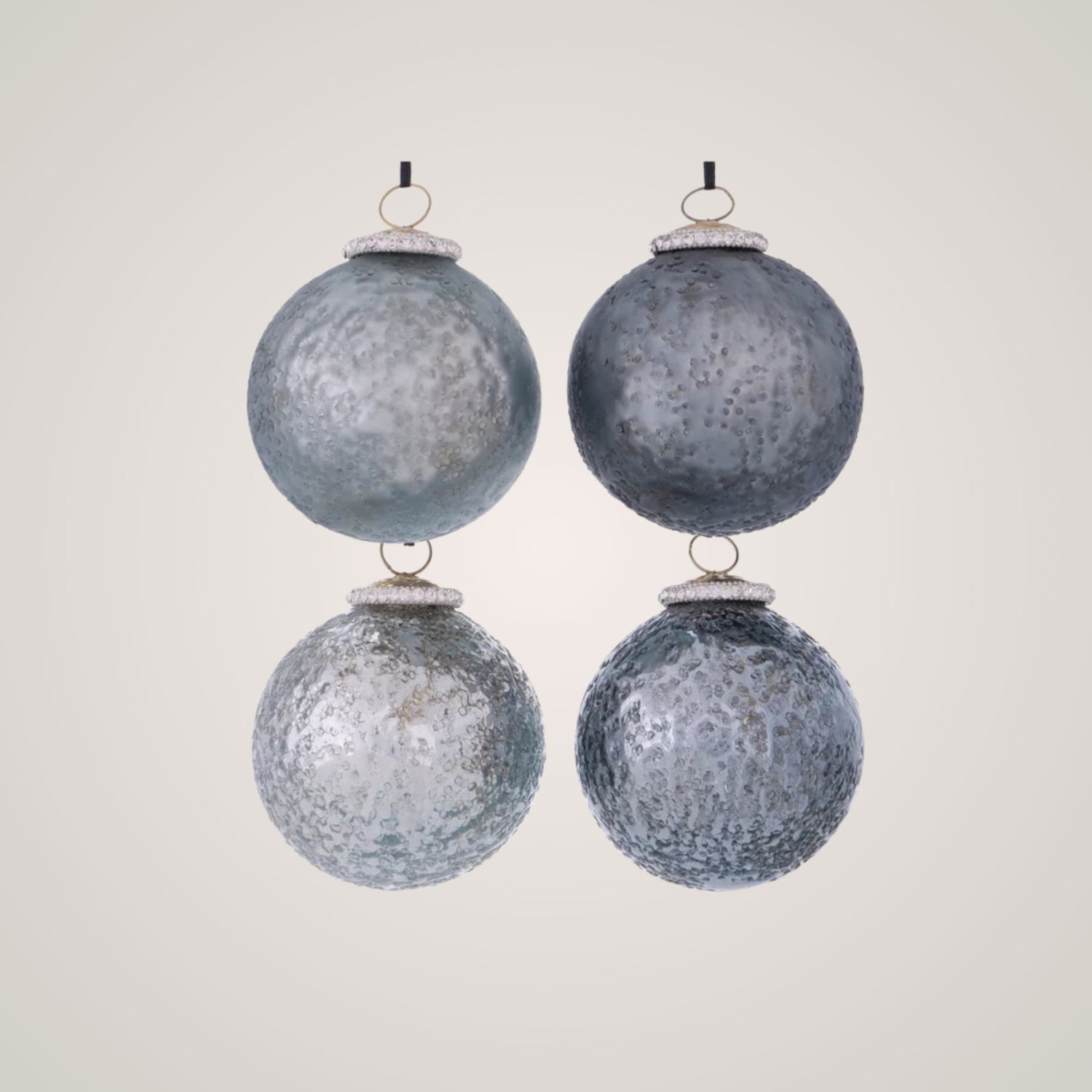Kulene har et elegant design med ulike overflater som skaper variasjon og liv i treet. Kombiner dem gjerne med hvitt, gull eller mørkere kuler for en helhetlig og gjennomført julepynt.