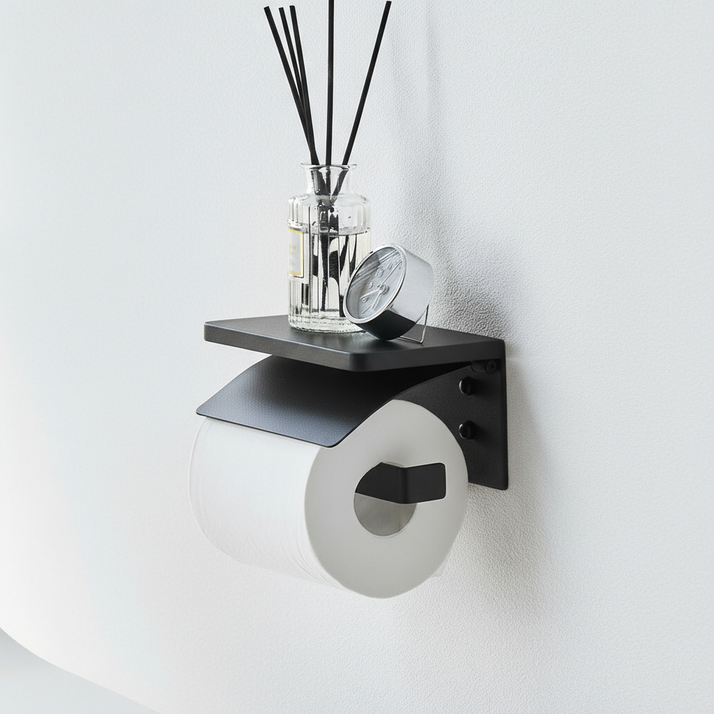 Holderen er laget i solid metall med matt sort overflate som tåler fukt og daglig bruk.